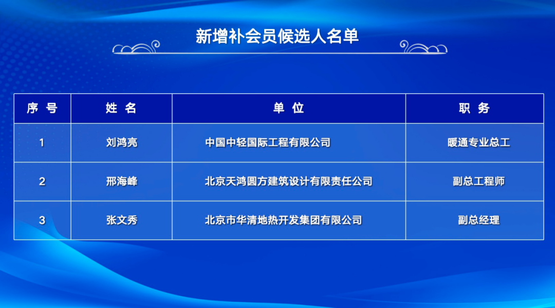 经张杰会长提议,经与会代表集体举手表决,全体通过新增补成员候选人名单。新增补成员分别为:中国中轻国际工程有限公司暖通专业总工程师刘鸿亮、北京天鸿圆方建筑设计有限责任公司副总工程师邢海峰、北京市华清地热开发集团有限公司副总经理张文秀。欢迎三位新成员单位代表加入集体。