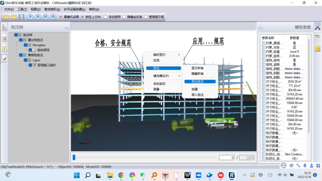 2、基于转换后的三维轻量化模型,直接进行本地审阅、批注和反馈,一键导出批注意见xml文件,发送到任何协作方(邮件、QQ、微信均可),一键导入即可获取当前批注的可视化意见。