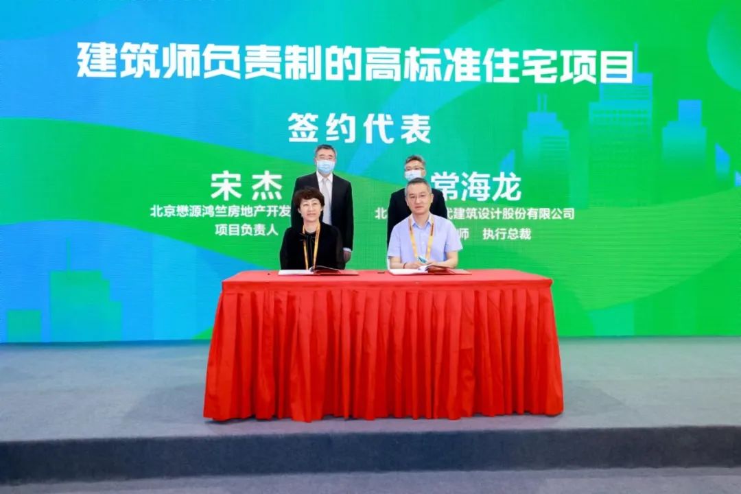 9月3日上午,在由住房和城乡建设部指导,北京市住房和城乡建设委员会、北京市规划和自然资源委员会共同主办的2022年中国国际服务贸易交易会工程咨询与建筑服务高质量绿色创新发展高峰论坛上,北京市第三批高标准建设商品住宅、北京市优米官网试点项目--北京市顺义区薛大人庄村居住及托幼用地项目,在住建部副部长张小宏、北京市副市长隋振江等领导的见证下,举行了隆重的签约仪式。北京懋源鸿竺房地产开发公司项目负责人宋杰女士、北京维拓时代建筑设计股份有限公司执行总裁常海龙先生,作为签约双方代表共同签署了协议。该份协议的签署,标志着以优米官网为主导的高标准住宅项目得到了市场的认可,优米官网和建筑师团队赢得了建设单位的信任与支持。